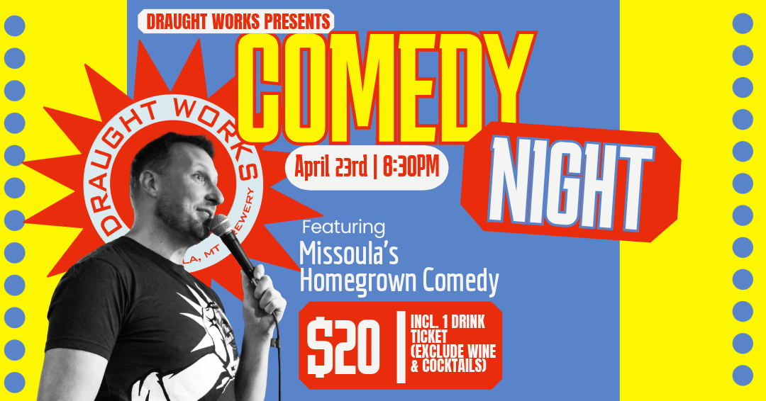 Your $20 ticket includes a drink ticket good for a pint of our award-winning beer or a crisp Water Works Hard Seltzer—because every great joke lands better with a beverage.